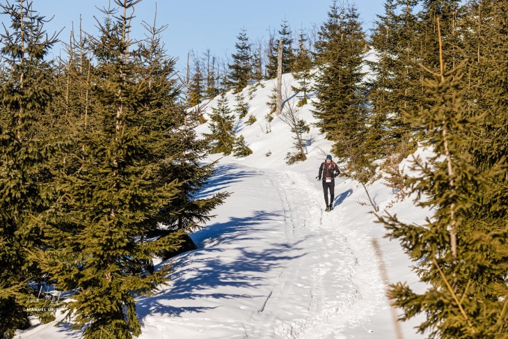 zdjęcie: Manuel Uribe PhotographyPo chwili na złapanie oddechu przyszedł jednak czas by ruszyć w dół. Charakterystyczne kamieniste zbiegi, które o innych porach tak bardzo dają się we znaki, ustąpiły miejsca ubitym biegostradom, pozwalającym naprawdę komfortowo przemierzać kolejne kilometry. Szybki postój na niemalże kultowym punkcie odżywczym w Fajkówce, na którym to już tradycyjnie prowiant schodzi na drugi plan a na pierwszy wybija się jedyna w swoim rodzaju ekipa wolontariuszy obsługujących napływających piechurów. Łyk ciepłej herbaty, ładowanie węgli i wracamy na śnieżne tory. Po kilku mniej lub bardziej stromych zbiegach docieramy do uwielbianego przez stałych bywalców Barana gęsto zarośniętego podejścia, które nawet o tej porze roku jest niemałym wyzwaniem dla twarzy, nieustannie smaganej przedstawicielami miejscowej flory. Po chwili jednak udaje nam się wydostać na nieco bardziej otwartą przestrzeń i rozpoczynamy zbieg do Węgierskiej Górki, gdzie na punkcie odżywczym wita nas organizator oraz wolontariusze. Doskonale wiemy, że przed nami kilka kilometrów delikatnego asfaltowego podejścia nim znów znajdziemy się na szlaku, więc w drogę zabieramy kanapki i ciepłą herbatę, by wykorzystać ten fragment trasy na spokojne naładowanie baterii.