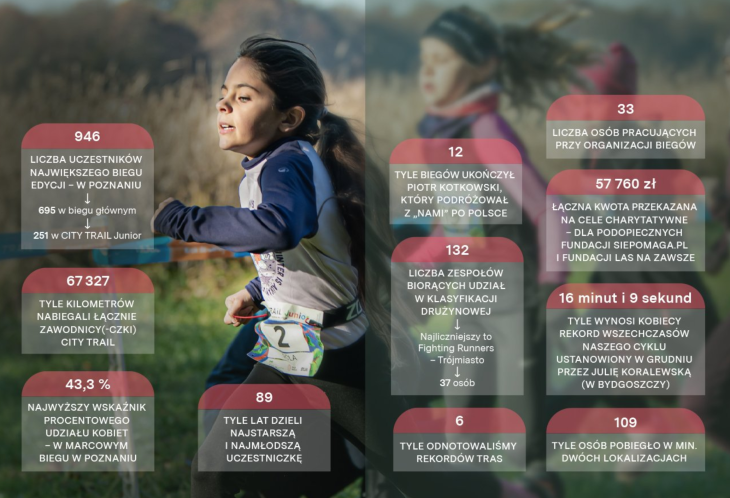 Cykl CITY TRAIL od lat pozostaje jednym z najbardziej rozpoznawalnych projektów biegowych w Polsce. Od ponad 20 lat amatorzy jak i zawodnicy z krajowej czołówki mogą rywalizować w naturalnym, przełajowym terenie przez całą jesień i zimę. Sezon 2025/2026 przyniósł jednak wyraźne zmiany organizacyjne, jak i sportowe. Podsumujmy. Najważniejszą nowością była zmodyfikowana formuła. Rywalizacja odbywała się w siedmiu miastach: Bydgoszczy, Katowicach, Poznaniu, Szczecinie, Trójmieście, Warszawie i Wrocławiu. Łącznie zorganizowano 28 biegów, w których wystartowało ponad 5300 uczestników. Co istotne, projekt niezmiennie stawia na aktywizację najmłodszych. W zawodach dla dzieci i młodzieży wzięło udział ponad 1700 młodych sportowców.