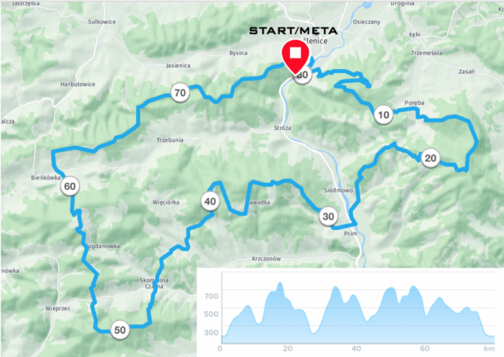 Dalej na zawodników na najdłuższych dystansach czeka esencja ultra, najpierw wspinaczka pod szczyt Łysina - 891 m n.p.m. (najwyżej położony punkt na trasie). Następnie biegacze zbiegną w kierunku miejscowości Pcim, miną kilka asfaltowych i brukowych fragmentów, a następnie rozpoczną drugi wymagający podbieg na szczyt Pękalówka (838 m n.p.m.). Na następnym szczycie – Kotoń, trasy 80 km i 51 km rozdzielą się. Ci, którzy zdecydują się na najdłuższy dystans, pobiegną w stronę miejscowości Skomielna Czarna, z której to rozpocznie się podbieg pod szczyt Stołowa Góra (841 m n.p.m.). Dalej uczestnicy będą musieli podbiec jeszcze pod Koskową Górę (866 m n.p.m.), następnie po zbiegu do miejscowości Bieńkówka pokonać ostatni wydłużony podbieg pod szczyt Babica, a potem już tylko sama przyjemność, bo do mety albo płasko albo z górki.