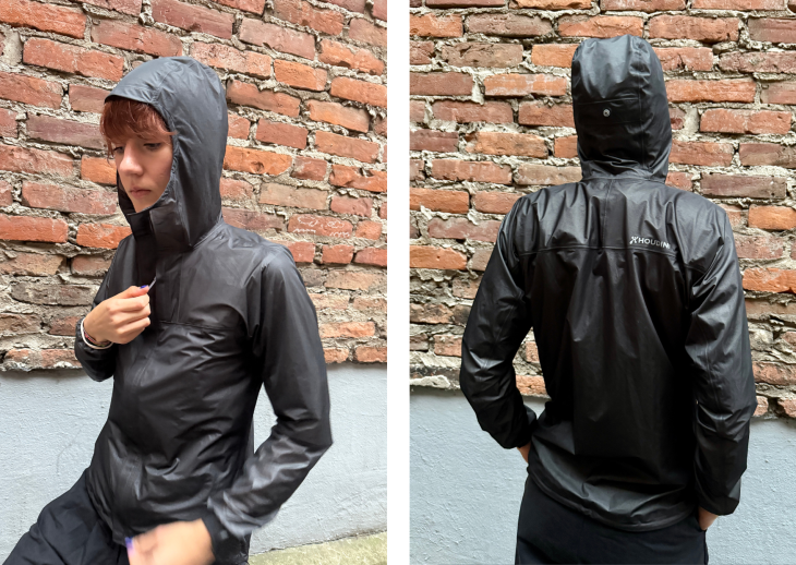 The Orange Jacket jest jak mgiełka. Waży ok.170 gramów, więc nosząc ją w plecaku i na sobie w ogóle jej nie odczujesz. Wykonana jest z gładkiego, elastycznego i przyjemnego w dotyku materiału. Również od wewnątrz nie klei się do skóry jak cerata. A do tego nie szeleści! Ten model kurtki Houdini ma prosty krój i tylko niezbędne, funkcjonalne dodatki: jedną kieszeń na piersi i kaptur, który można zwinąć. Zakończenie rękawów i dół kurtki są elastyczne. Jest bardzo estetycznie wykonana i dopracowana w detalach.