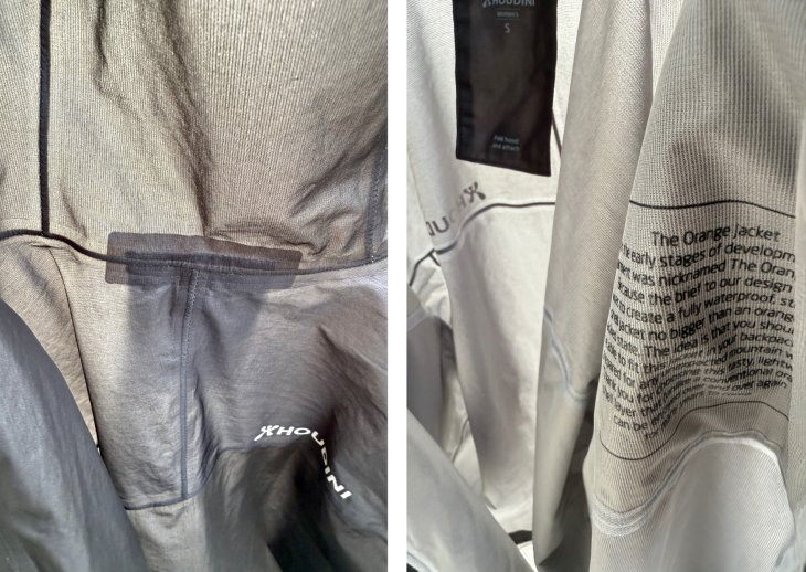 Powłoka zewnętrzna kurtki Orange Jacket to wyprodukowana w Japonii 3-warstwowa w pełni wodoodporna membrana Atmos™ o wysokich parametrach oddychalności. Wykonana z poliestru w 100% pochodzącego z recyklingu i nadającego się do recyklingu, co pozwala na zamknięty cykl życia produktu, w którym nic nie staje się odpadem. Jest również całkowicie wolna od toksycznych substancji chemicznych i PFAS. Gdy się zużyje można ją zwrócić do Houdini. Firma posiada punkty recyklingu we wszystkich swoich sklepach i u wielu sprzedawców detalicznych.