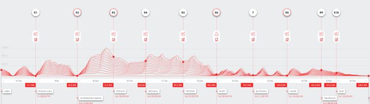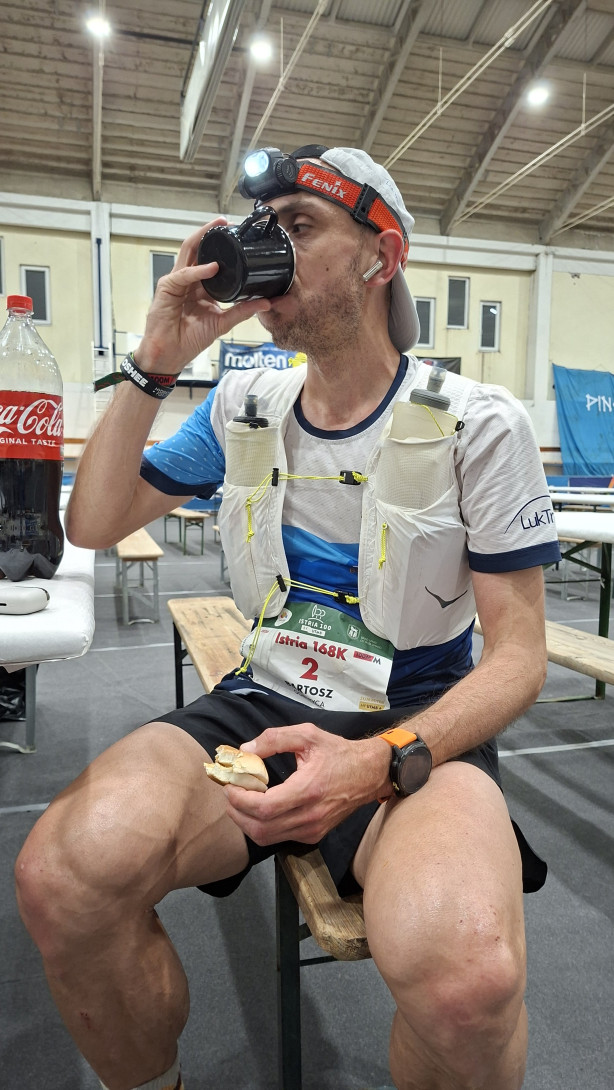 Chwila nieuwagi spowodowana tym, że złapałem fajny rytm. Żołądek na chwilę odpuszcza, łapię flow po czym gubię trasę. Na szczęście zegarek w porę reaguje i nadrabiam może z 200m. Setny kilometr. Punkt Buzet. Potężna hala z przepakiem, ogromną ilością stołów i moim supportem. Wsuwam kanapki, popijam kawą, a w międzyczasie wymieniają się żele i bidony. Nie jest źle. Dobrze też nie. Niedojadam zaplanowanej ilości żeli przenosząc je niczym wielbłąd ładunek w karawanie. Oby to się nie skończyło katastrofą.