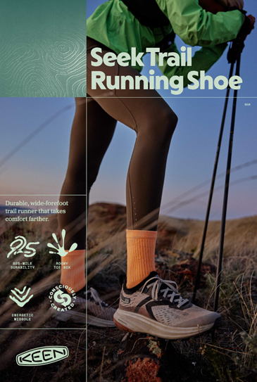 KEEN szybko rozwinął swoje portfolio, wprowadzając zaawansowane technologicznie i wygodne obuwie dostosowane do różnych warunków, od modeli wodnych, przez trekkingowe, aż po zimowe i użytkowe i od teraz biegowe. Nadchodząca wiosna będzie przełomowa! KEEN zaprezentuje pierwszą w swojej historii kolekcję butów trailowych, odpowiadając na rosnące zainteresowanie biegami terenowymi. Marka tworzy produkty dla kobiet, mężczyzn i dzieci, uzupełniając ofertę o praktyczne akcesoria, takie jak torby czy skarpety zaprojektowane zgodnie z ideą funkcjonalności i komfortu.