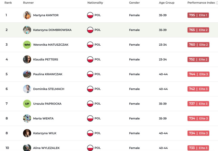 Dla kobiet elitę elit przyjęto na poziomie 775 ITRA i w ogólnym rankingu przekracza go tylko Martyna Młynarczyk z dorobkiem 795 ITRA, co plasuje ją na 35 miejscu na świecie w rankingu ITRA.