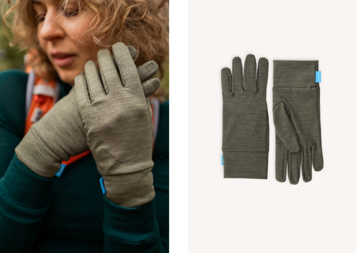Cienkie rękawiczki typu linery w kolorze oliwkowy melanż, wykonane w 95% z wełny merino, Wełna zapewnia oddychalność, odprowadza wilgoć, zapobiega nieprzyjemnym zapachom i szybko schnie. Sprawdzają się idealnie podczas biegania lub innych aktywności, gdy dłonie się szybko nagrzewają. Lekka dzianina daje komfort i elastyczność, a dopasowany krój pozwala na swobodne ruchy i warstwowanie z grubszymi rękawicami, jeśli potrzeba.