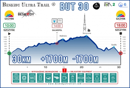 bukłak lub bidon/bidony o łącznej pojemności co najmniej 1 litra oraz zapas wody lub napoju minimum 1 litr (sprawdzany przy wyjściu z punktu odżywczego); dla dystansu BUT Challenge wymagana pojemność 2 litry