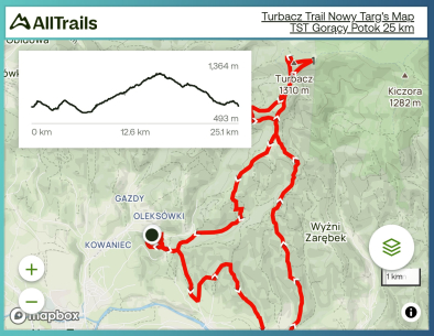 - wgrany aktualny track lub mapa dystansu, na którym się startuje – aktualny track do pobrania z regulaminu lub strony www organizatora – www.turbacztrail.pl