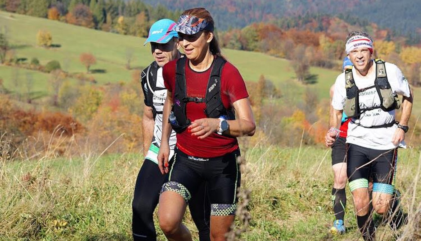 Start z deptaka w Iwoniczu. Pogoda cudo, żyleta, rześko, kolorowo. Ubrana na lekko, ustawiam się po rozgrzewce na przodzie stawki. Widzę Mamę. Wiem, że bardzo to przeżywa, dlatego uśmiecham się do niej, macham i może aż za bardzo się rozpraszam. Obok mnie Janusz i Tomek. Chłopaki mnie mocno wspierają i gadają takie fakty, że zaczynam wierzyć w siebie bardziej, a nawet czuję z oddali zapach zwycięstwa. Strategia jest jak zawsze - mocny początek, żeby zrobić przewagę i uniknąć korków na szlaku. A potem utrzymać to. Wszystko idzie jak z płatka. Trzymam pozycję w tzw. czubie. Czuję się świetnie. Frunę. Wybiegamy z Iwonicza, lekki zbieg, asfalt. Sekunda nieuwagi i zaliczam fatalną wywrotkę - zdarte kolano i łokieć, podarty plecak i buty, bo takie to było koziołkowanie. No i ta kostka, a właściwie staw skokowy prawy... Zabolał, ale co tam. W sekundę upadłam i w sekundę się zebrałam. Biegniemy dalej. Kostka boli, lecz ignoruję to i wypieram. Łokieć piecze i krwawi, kolano też, ale kto by się mazał. Odcinam wszelkie pytania, czy wszystko ok ze mną i pędzę dalej w pełni mocy i w poczuciu, że będzie dobrze. Wpadamy do Rymanowa. Jestem na pierwszej pozycji wśród kobiet. To niesie i dodaje sił. Jak na meczu, gdy złapiesz piłkę, to nie chcesz oddać.